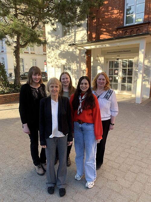 The photo, taken by Christian Helbig, shows from left to right: Dr. Marie-Luise Sellin (GRK 2901 SYLOBIO), Dr. Anne Bernhardt (TU Dresden), Vivica Freiin Grote (SFB 1270 ELAINE), Irem Simsek (GRK 2901 SYLOBIO), Dr. Annett Klinder (Research Laboratory FORBIOMIT) in front of the Orthopedic Clinic and Polyclinic of the University Medical Center Rostock.